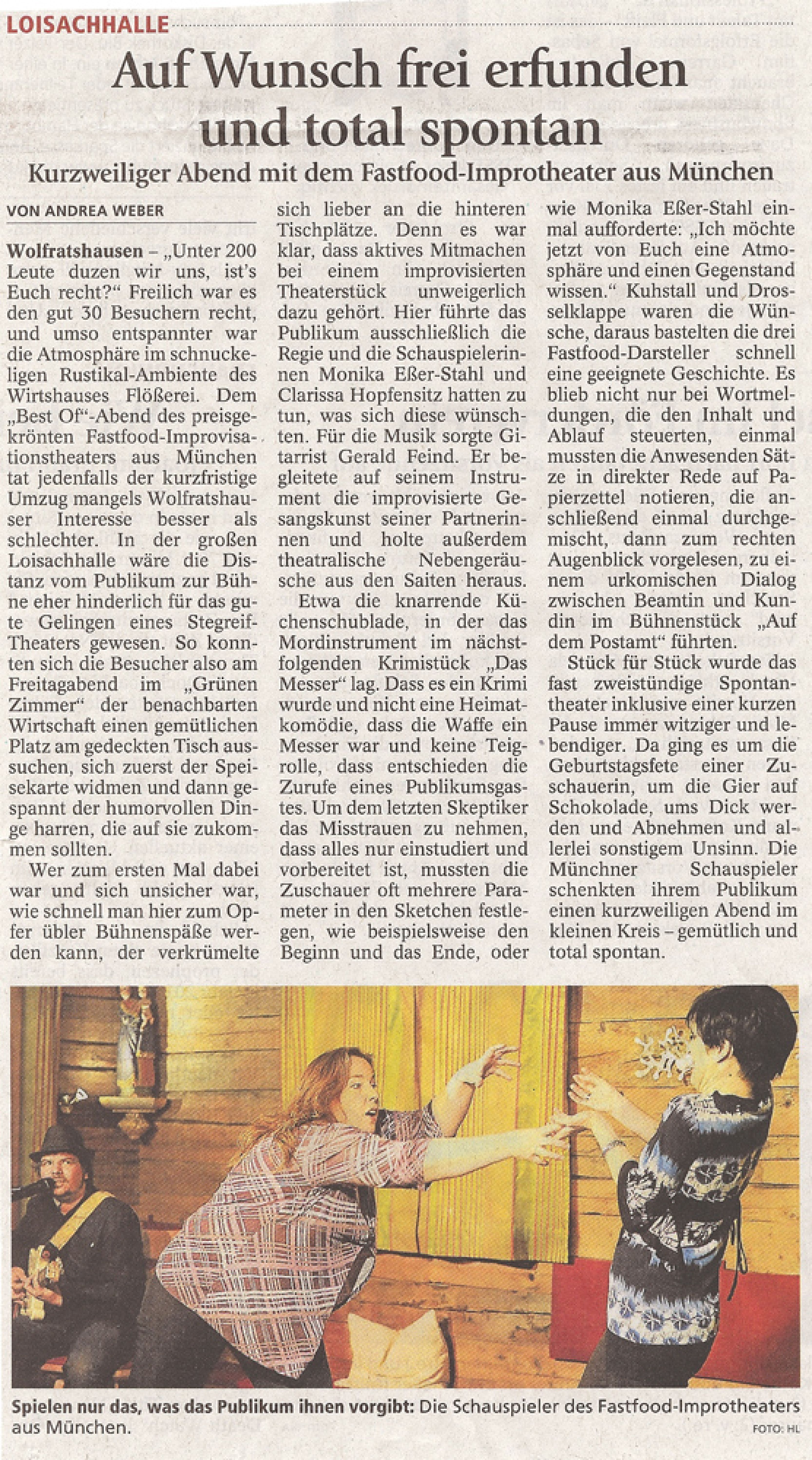 Sie sind ein Ur-Gestein der deutschen Impro-Landschaft: Das Fastfood-Theater. Zahlreiche Auszeichnungen, unzählige Shows pro Jahr und ein unbestrittenes Renommée machen dieses Ensemble zu einem wichtigen Bestandteil der deutschsprachigen Kleinkunst-Szene. Obwohl ich nicht zum festen Musiker-Ensemble des fastfood-theaters zähle hatte ich doch einige gemeinsame Auftritte mit dieser Gruppe.