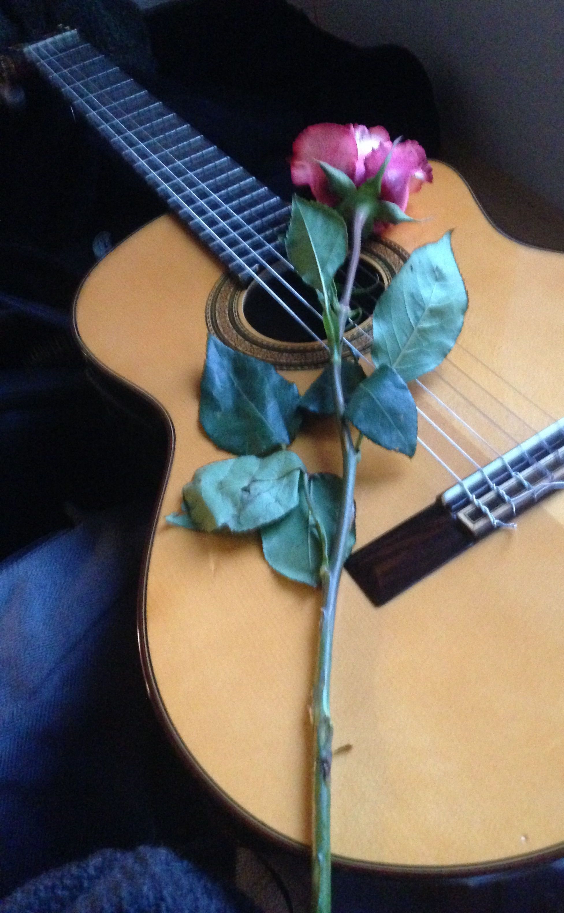 Gitarre und RosenWer viele Konzerte spielt, droht abzustumpfen. Gerade wenn die Auftritte überwiegend mit der gleichen Band oder ähnlichem Repertoire stattfinden, tritt Lampenfieber immer seltener auf.