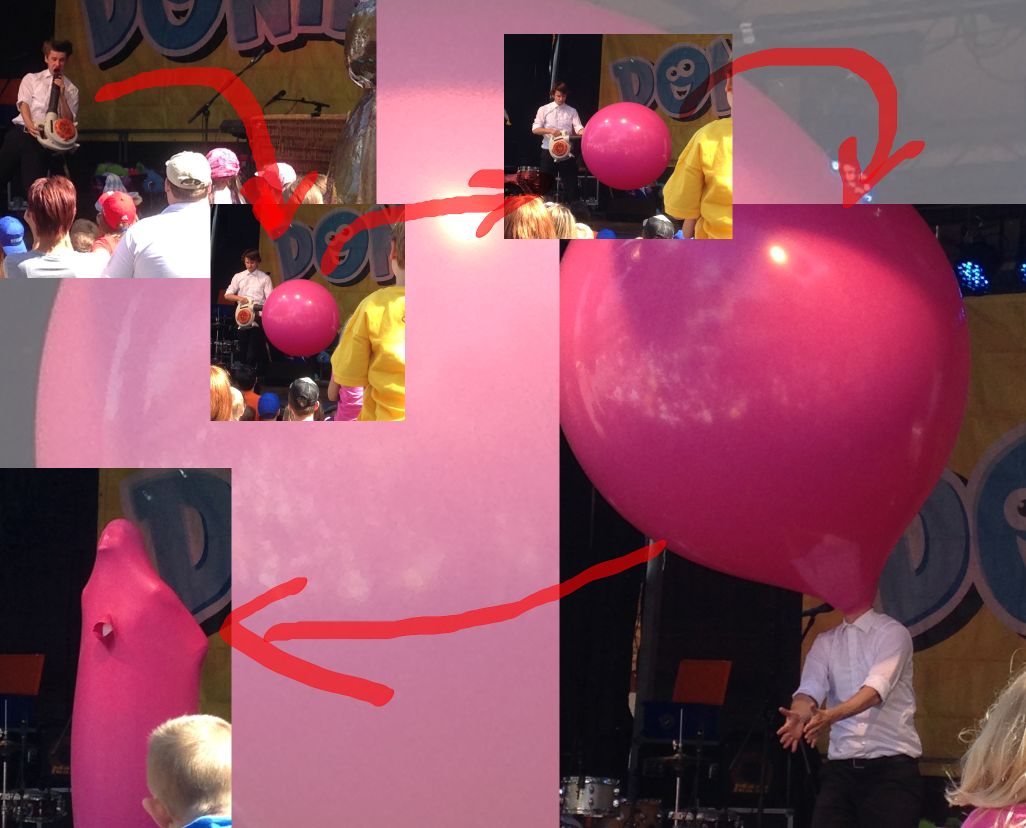 ...mit einem umfunktionierten Laubbläser blähte er am Ende seiner wunderbaren Family-Fun-Show einen riesigen Luftballon zur Überlebensgröße auf. "Always finish with a bang", lautet ein altes Show-Biz-Gesetz – und so pumpt Tobi die Gummiblase derart ans Limit, bis er selbst hineinschlüpfen kann, drin tanzt und feixt und schließlich das Ding auch noch zum Platzen bringt.