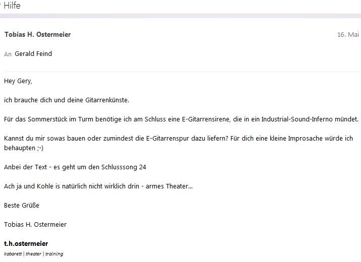 "Eine E-Gitarrensirene, die in ein Industrial-Sound-Inferno mündet" – so hatte es sich Tobias gewünscht. Und genau das hat er bekommen: die Töne "a" und "e" und "a" und "e" und "a" und "e"... sie sägen sich gegen Ende der zweiten Hälfte förmlich in den Theatersaal. Kurz nachdem das Licht abdimmt, das Publikum mit schweigendem Fragezeichen da sitzt ("Ist das das Ende?") setzt sie ein, die erste von zahllosen Gitarren in dem fast 2-minütigen "Inferno-Song".