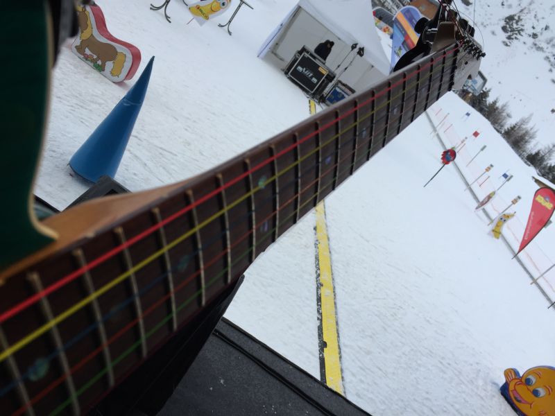 Genug gejammert (ein Cowboy "Kört" muss da eben durch!), denn schließlich lief alles wie am Schnürchen: pünktlicher Soundcheck, tolle Show und keine technischen Ausfälle. Ich finde die Bilanz kann sich sehen lassen angesichts dutzender kleiner und großer Schistiefel-Paare die auf der Bühne tanzten, Frostbehandlung für Gitarrensaiten und Pulverschnee auf dem Gitarrenverstärker. Ein Härtetest, nicht nur für klamme Finger!