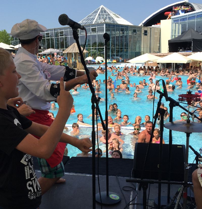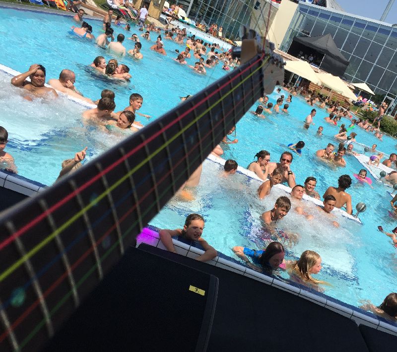 Kein Donikk-Konzert ist wie das andere. So spielten wir beim Sommerfest der Therme Erding direkt vorm großen Pool in der Außenanlage. Außer uns alle im Wasser. Was für eine ulkige Kulisse!